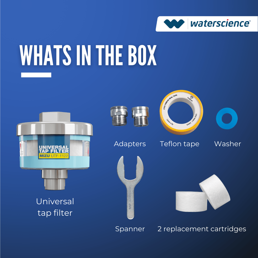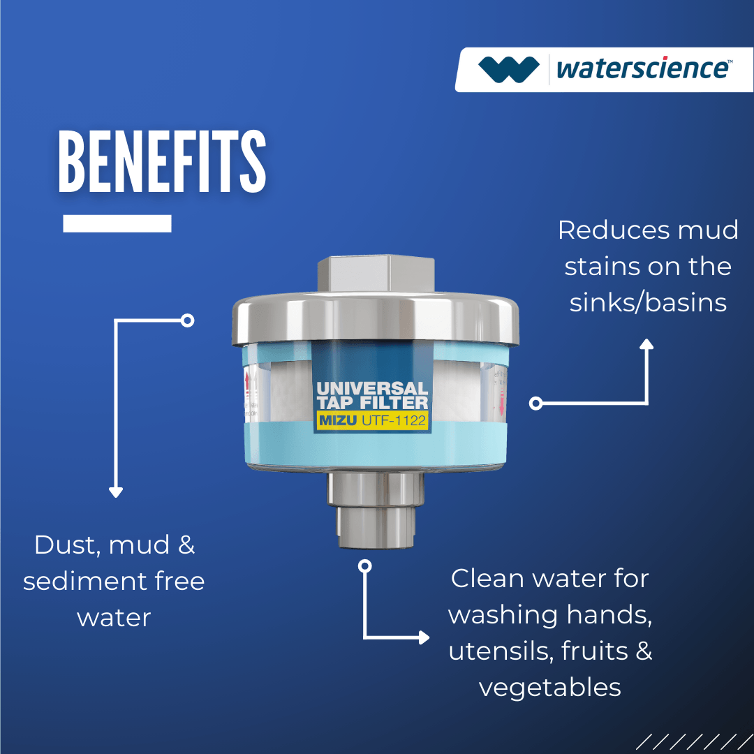 The MIZU-UTF-1122 universal tap filter is specially designed to remove dust, sand, rust and other impurities as small as 5 microns to provide you with cleaner and clearer water. MIZU is recommended for areas with high levels of TSS (total suspended solids) in the water. This filter however, is NOT designed to reduce hardness or TDS of the water.
